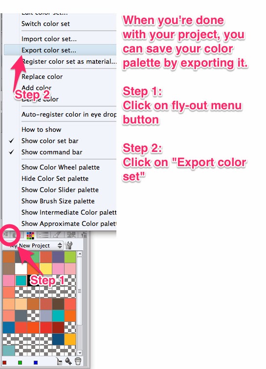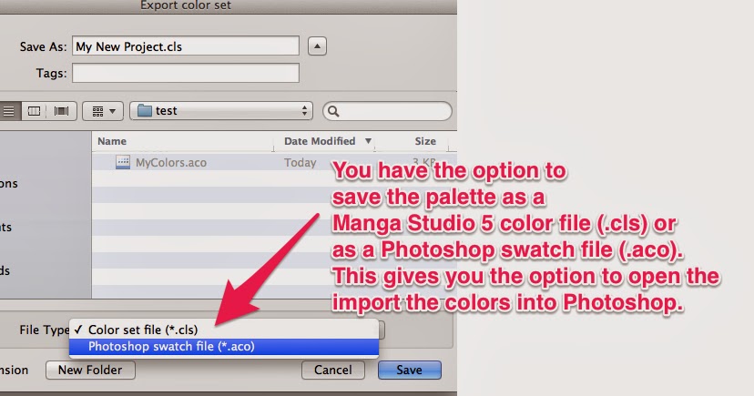 • Tip 1 is how I save the color swatches I use in Photoshop and import them into Manga Studio 5. This allows me to go back and forth between the two programs and keep the colors consistent.