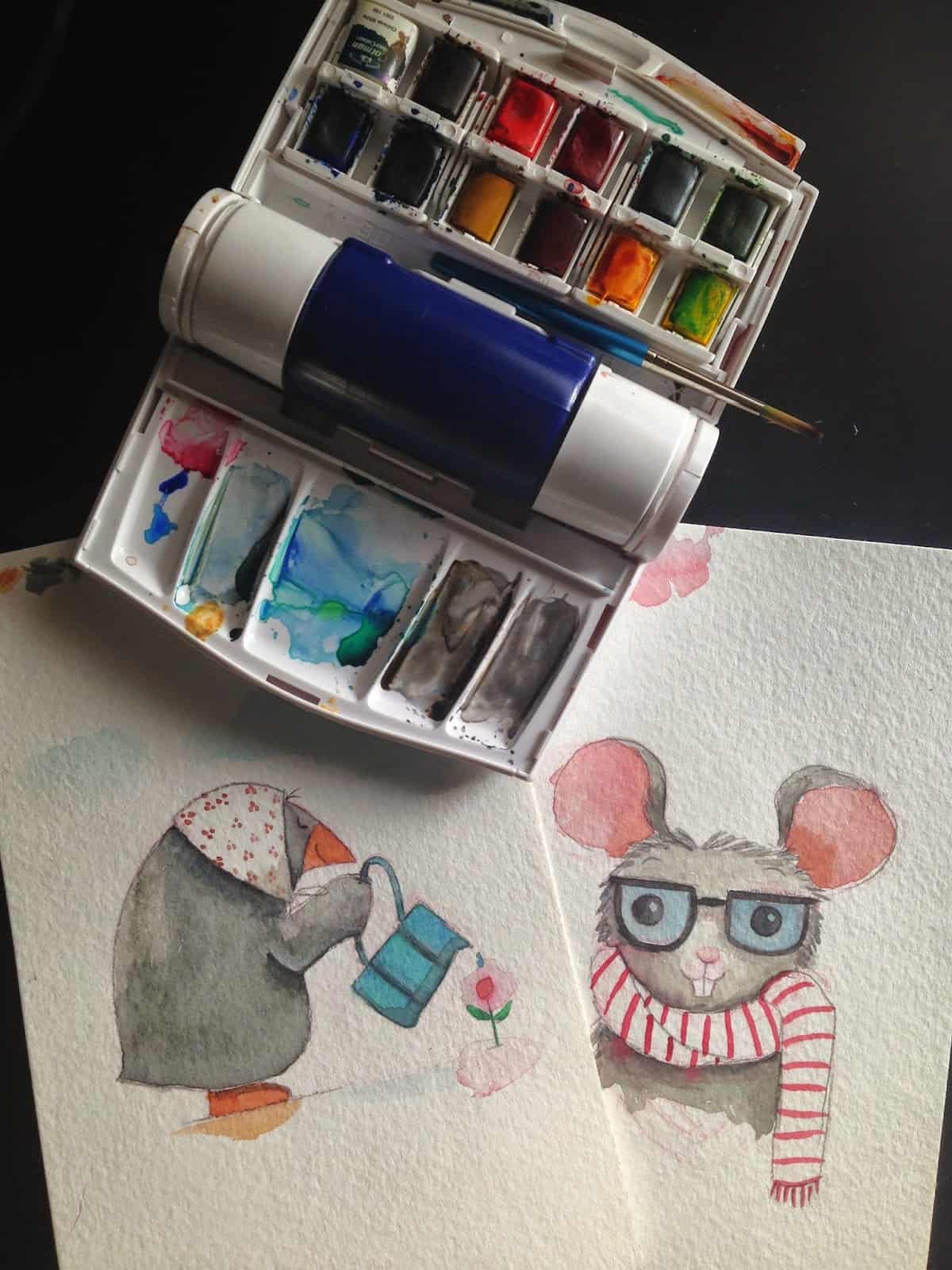 Since I’m not yet able to post images from the current book I’m working on (A Morning with Gong Gong, Lee & Low), here are a couple little paintings I’ve been doing for fun. I’ve had this Windsor & Newton travel watercolor set for a couple years, but I’ve hardly used it. I decided to pull it out and simply mess about! Though watercolor isn’t as forgiving as my computer, it’s been fun to make marks on paper and delight in happy accidents. I’m hoping these little exercises in watercolor will spill over and help me with some spontaneity in the digital world of painting. Here’s to having fun with real paint!