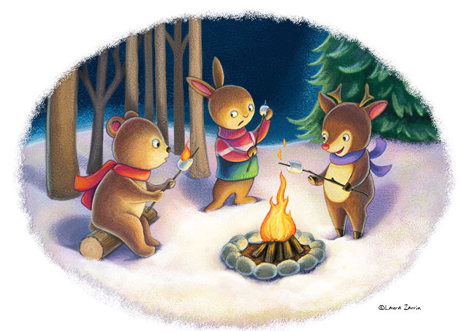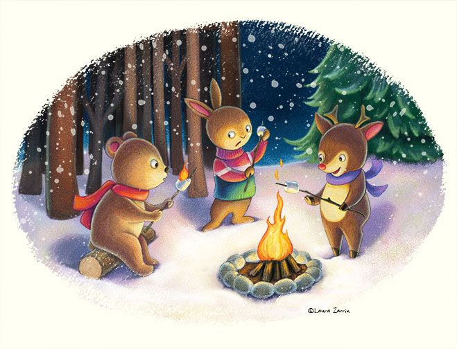 I needed an illustration for the local Illustrators Day's First Look Panel later this month. I didn't have time to created something from scratch, so I decided to see if I could improve one of my existing pieces. I chose this one which I always liked, but felt was still missing something. I wanted to add more depth and drama to it, so I added snow and more trees to the background. I started with a blizzard, then ran it through some of my toughest critique friends, my SMA blog group of Tracy Bishop, Christina Forshay, and Renee Kurilla, and my friend Gina Perry. Their advice was to have fewer and larger snowflakes, to darken and redden the trees, change the border, and make the white border a softer color. (Almost all of the changes were done in Photoshop. The snow and border were ink paintings that I scanned in and manipulated in Photoshop.)
