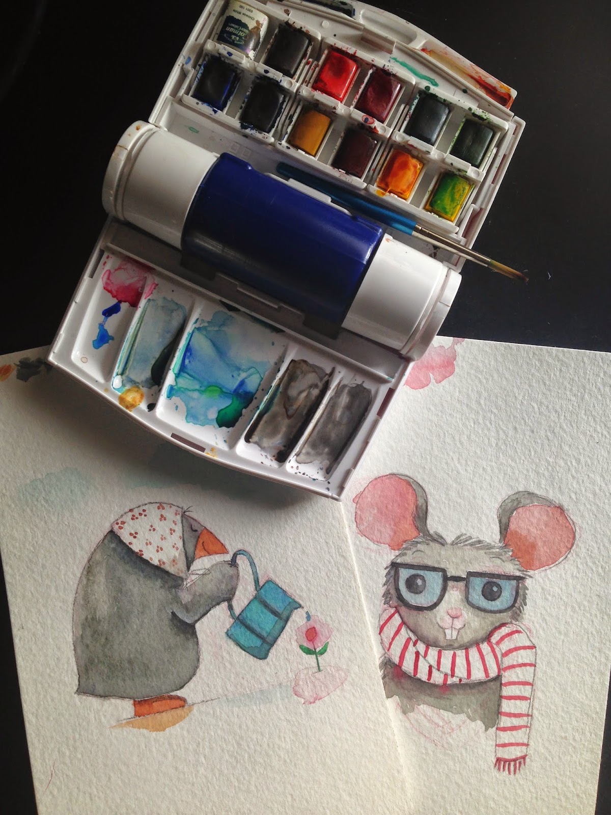 Since I'm not yet able to post images from the current book I'm working on (A Morning with Gong Gong, Lee & Low), here are a couple little paintings I've been doing for fun. I've had this Windsor & Newton travel watercolor set for a couple years, but I've hardly used it. I decided to pull it out and simply mess about! Though watercolor isn't as forgiving as my computer, it's been fun to make marks on paper and delight in happy accidents. I'm hoping these little exercises in watercolor will spill over and help me with some spontaneity in the digital world of painting. Here's to having fun with real paint!