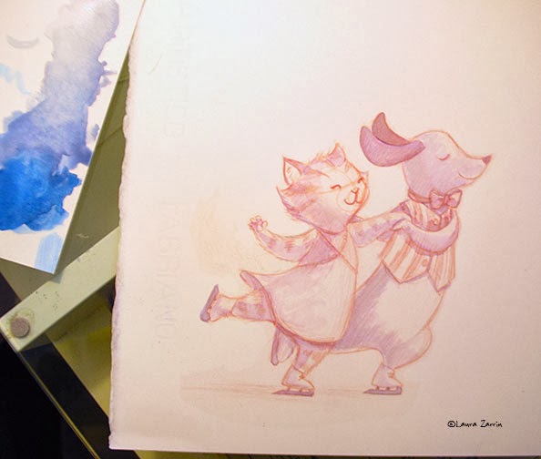 In this first photo I first printed out a colorized sketch onto my Fabriano hot press watercolor paper (reddish sketch). Then I painted in the shadows with a mix of blue gouache and purple acrylic ink.